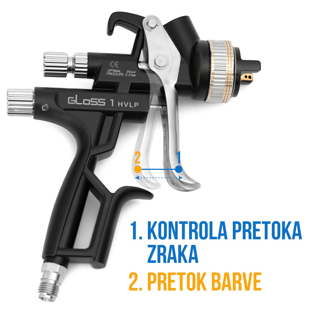 Pištola omogoča popolno kotrolo zračnega pretoka. Sprožilec pritisnete, da se ustavi in s tem preverite ali pretok zraka deluje, šele ko boste sprožilec pritisnili do konca, bo skozi šobo pritekla tudi barva. S tem si zagotovite, da pri lakiranju ne bo prišlo do napak.